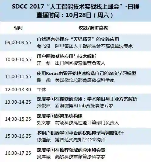 基于此,CSDN倾力打造了「SDCC 人工智能技术实战峰会」,邀请了来自阿里巴巴、微软、商汤科技、第四范式、微博、出门问问、菱歌科技的AI专家,将针对机器学习平台、系统架构、对话机器人、芯片、推荐系统、Keras、分布式系统、NLP等热点话题进行7场技术专题分享。