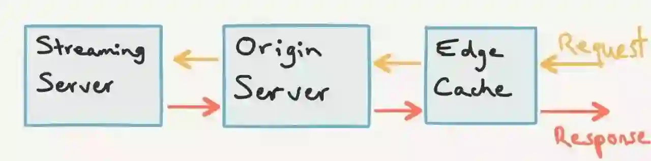 如果 Origin Server 中没有,请求就会被转到 Streaming Server,然后数据返回给 Origin Server,再经由 Edge Cache 返回给用户,同时,Origin Server 和 Edge Cache 都会进行缓存