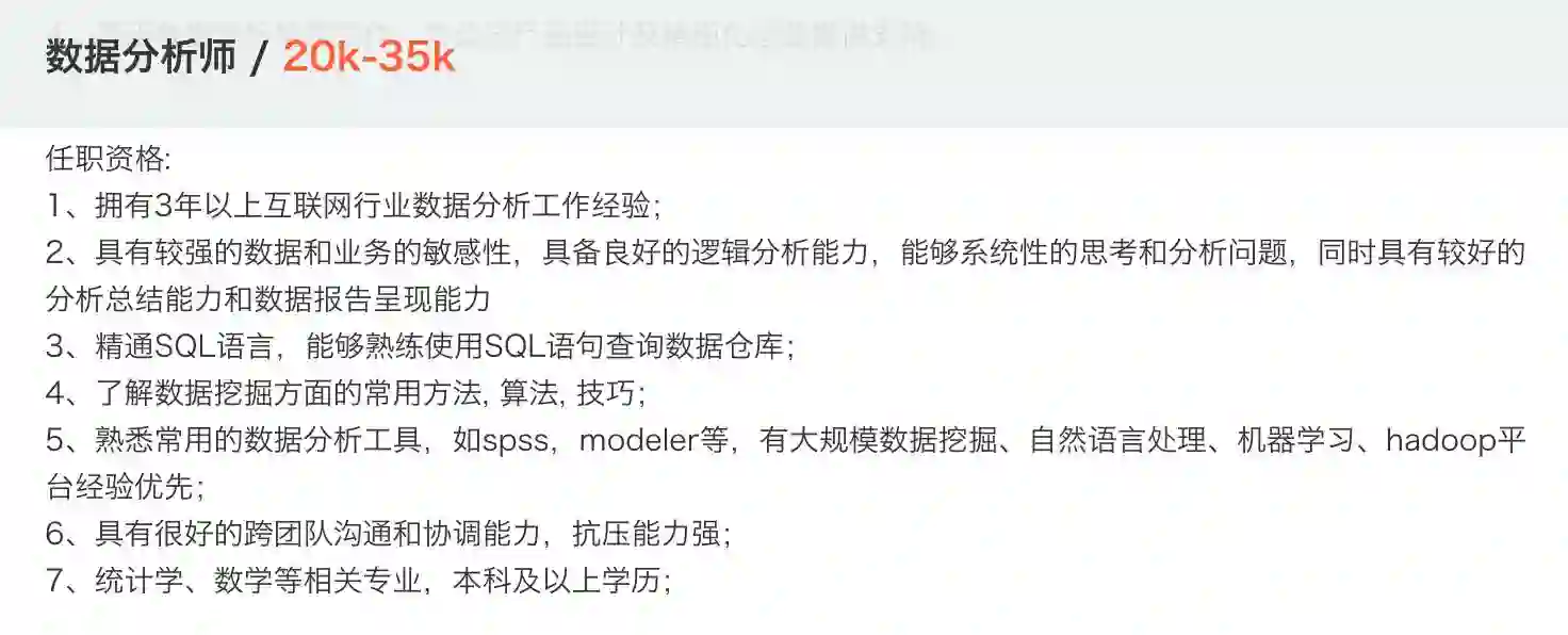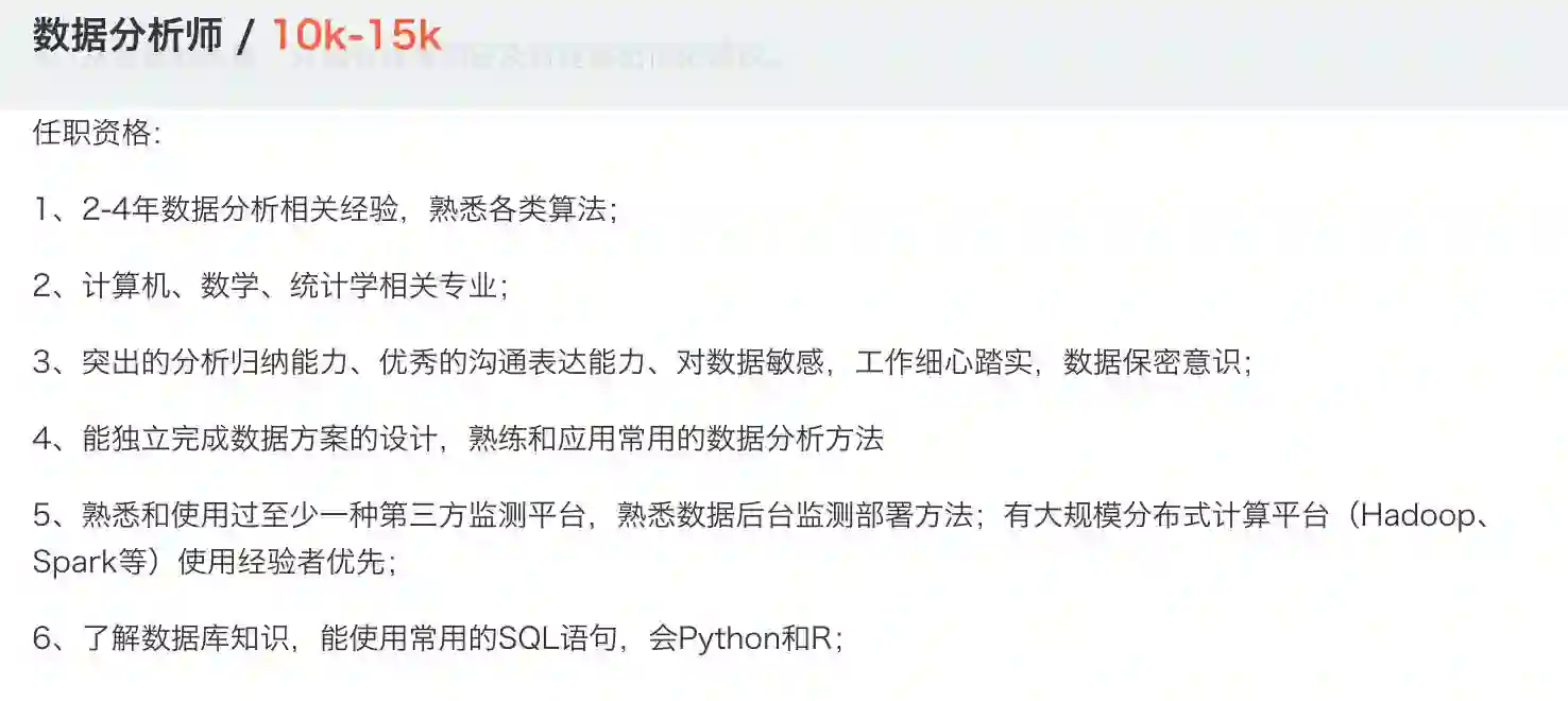 我们从拉钩上找了一些最具有代表性的数据分析师职位信息,来看看薪资不菲的数据分析师需要哪些技能。