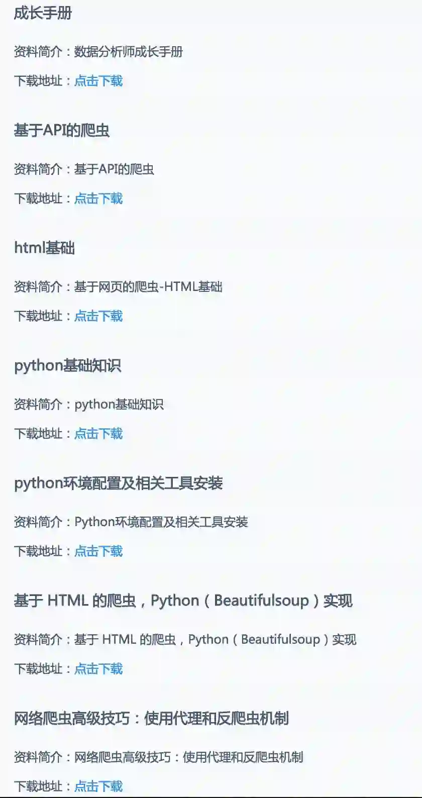 除了帮助你实现课程中老师的案例,我们还将提供很多的课外练习,全都是你最可能会用到的案例。比如老师会讲如何用python爬取豆瓣TOP200的电影,但是你不会爬取知乎的高票答案啊,招聘数据自己也爬不了,好气呀,怎么办?