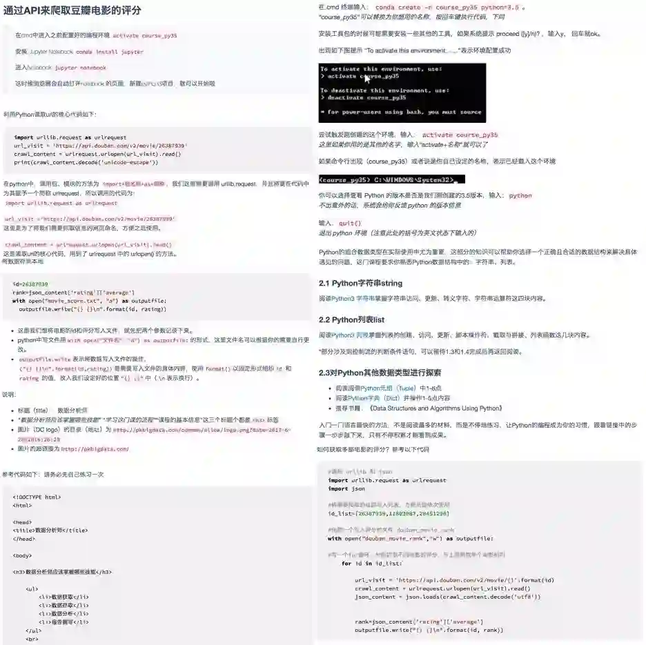 第三种是编写网页爬虫,收集互联网上的数据。比如你可以通过爬虫获取招聘网站某一职位的招聘信息,爬取租房网站上某城市的租房信息,爬取豆瓣评分评分最高的电影列表,获取知乎点赞排行、网易云音乐评论排行列表。基于互联网爬取的数据,你可以对某个行业、某种人群进行分析,这算是非常靠谱的市场调研、竞品分析的方式了。