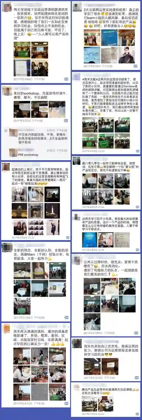 在互联网运营实战训练营2天线下+365天线上的学习中,你将和来自各行各业优秀的运营人成为同学,共同完成实战作业,碰撞思维火花,不仅能拓宽看问题的视野和思路,还能收获精准人脉。