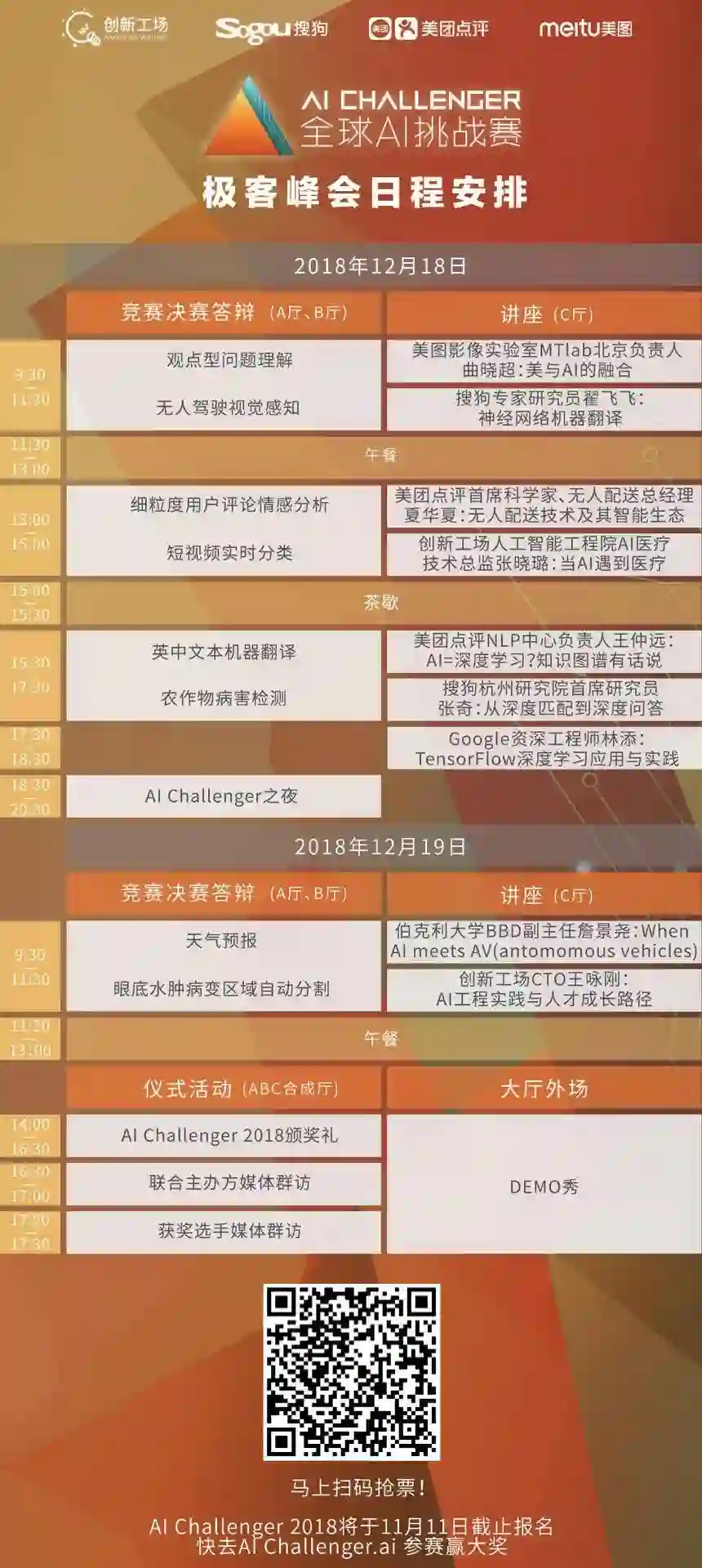 为了向AI人才提供更好的学习和交流机会,今年的AI Challenger不仅联合国内外资源,在世界各地举办了数十场线上线下的技术分享交流会;而且还将把今年12月18-19日的AI Challenger总决赛答辩暨颁奖礼升级为“AI Challenger 2018极客峰会”,包含总决赛答辩、技术论坛、Demo秀、颁奖礼、AI Challenger之夜等活动,并向AI Challenger社区用户开放,让这些AI人才和今年进入总决赛的几十只团队,顶尖的评委老师、产业专业,以及开复老师等大咖,面对面亲密接触。更有神秘奖品,联合主办方创新工场、搜狗、美团点评、美图公司提供的实习、工作、投资机会等着你!活动详情如下,马上扫码免费抢票!