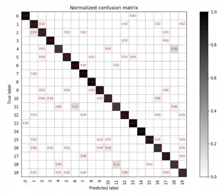 这是一个包含20个类别的分类任务,混淆矩阵为20*20的矩阵,其中第i行第j列,表示第i类目标被分类为第j类的概率,可以知道,越好的分类器对角线上的值更大,其他地方应该越小。