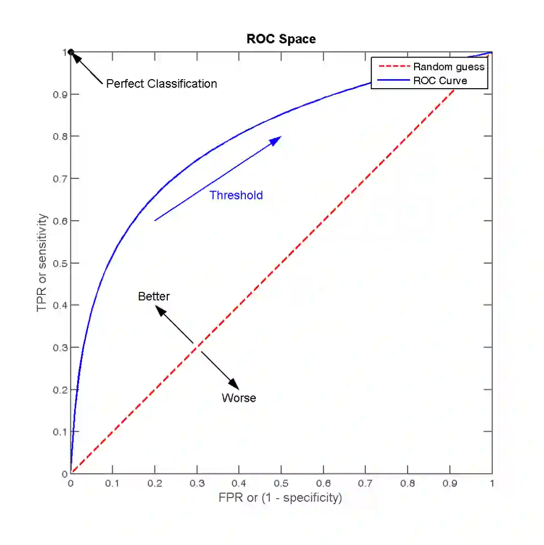 点(0,1):FPR=0, TPR=1,此时FN=0且FP=0,所有的样本都正确分类。