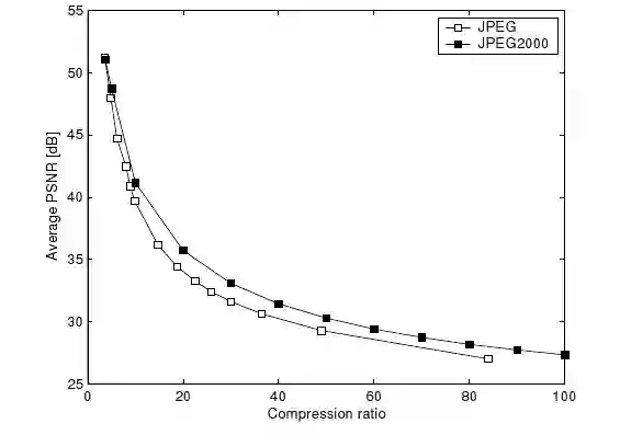 下面展示了JPEG和JPEG2000算法在不同压缩率下的PSNR,通常PSNR大于35的图像质量会比较好。