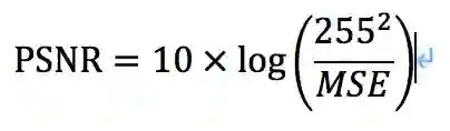 在图像处理领域,更多的是采用峰值信噪比PSNR (Peak Signal to NoiseRatio),它是原图像与处理图像之间均方误差(Mean Square Error)相对于(2^n-1)^2 的对数值,其中n是每个采样值的比特数,8位图像即为256。