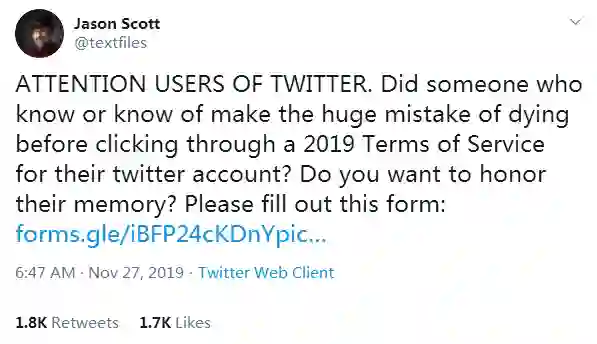 但此事还是在网上引发了一个更深层次的伦理问题——你是否希望你的 Twitter 账号永久保存,即使是在你去世之后?