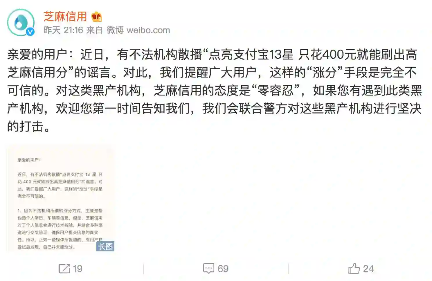对此,芝麻信用官方微博昨晚给出了官方回应。