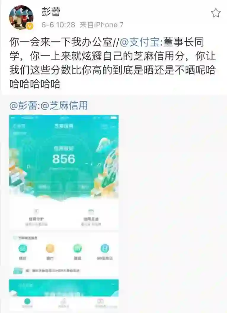 就在这一天,蚂蚁金服董事长彭蕾第一次发微博晒了自己的芝麻信用分:856分。但是,彭蕾的这个分数竟被支付宝微博小编比下去了。支付宝小编调侃彭蕾,“董事长同学,你一上来就炫耀自己的芝麻信用分,你让我们这些分数比你高的到底是晒还是不晒呢哈哈哈哈哈哈”。