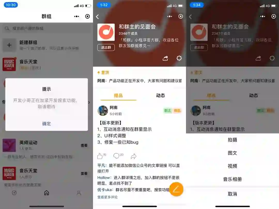 之所以说它是新型社区,这是因为相比于传统社区,用户可以在和群里自由创建群组,可以在群组里发图文、视频、音乐相册,还可以就感兴趣的话题点赞、评论、分享,实时互动。“感觉像是结合了朋友圈、直播、论坛、播放器的一种互动社区平台。”一位用户在“和群中的见面会”群里这样评论到。