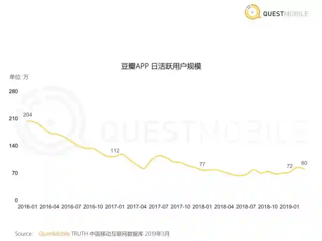 2005年,比百度贴吧晚两年的豆瓣诞生。虽然诞生日期相差两年,但两个产品的高光时刻几乎无差:2012年8月,豆瓣宣布月度覆盖独立用户数破1亿,日均PV为1.6亿。2013年第二、三季度,豆瓣月度覆盖独立用户数均达2亿,较上一年同期增长一倍。但如今,豆瓣的月活日活并不好看。QuestMobie数据显示,今年1月,豆瓣月活相比三年前几乎腰斩,降至400万左右;日活更是从204万下滑至80万。