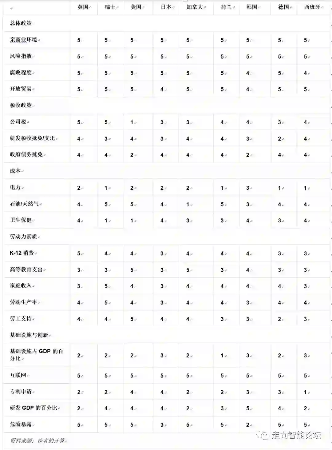 根据这20个指标,我们制定了100分制,对各国的制造环境进行排名。表5显示,最高国家包括英国(78分)、瑞士(78)、美国(77)、日本(74)、加拿大(74)和荷兰(74)。