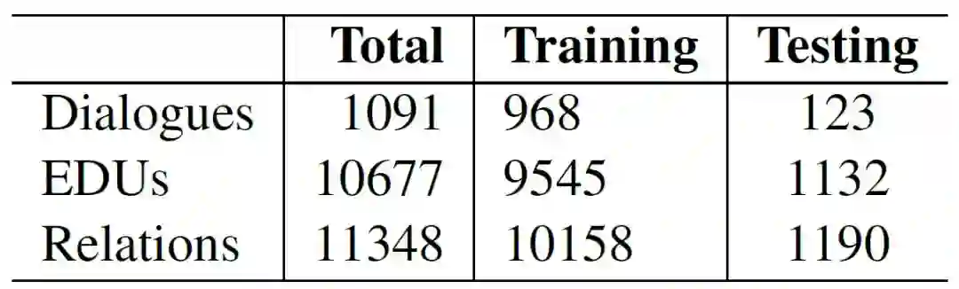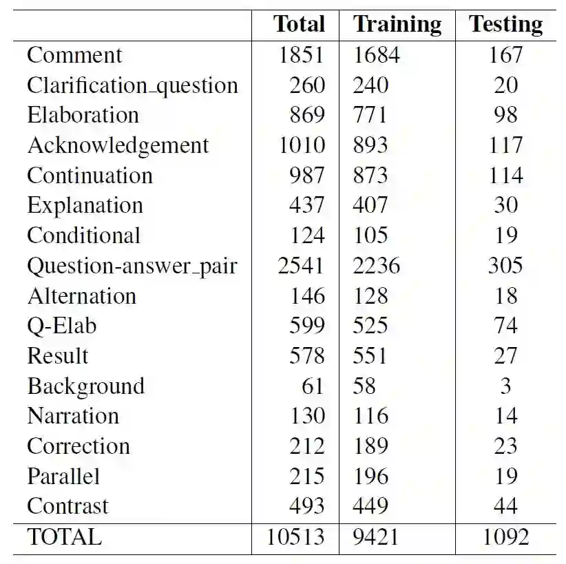 表1中列出了STAC语料的数据概况。从表1中我们可以看出该数据集中有10,677个EDU和11,348个关系实例,STAC数据集中的EDU通常为玩家发送的一条消息,或消息中的一个句子。表1还说明EDU之间的篇章语义关系相对稀疏,平均每个EDU仅有1.06个关系。
