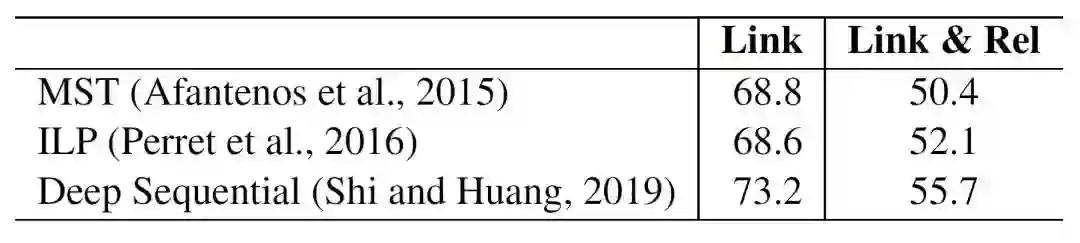 STAC数据集上现有模型的F1值结果如表3所示(更多基线结果可查看[4][5][6])。表中的Link代表边预测任务,即判断2个EDU之间是否存在篇章语义关系,是一个二分类任务;而Link & Rel 代表预测边和关系,在预测边的基础上,还需要进行16-分类的篇章语义关系分类以确定具体的语义关系类型。从表3我们可以发现,融合结构化表示和讲者信息的深度序列模型效果明显优于基于MST和ILP的方法,且省去了人工设计特征的工作。