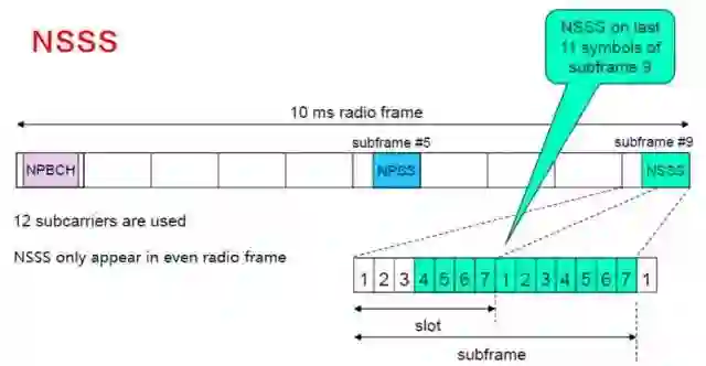 NSSS位于子帧#9,周期为20ms,仅出现于偶数帧,同样使用每子帧中的最后11个OFDM符号。
