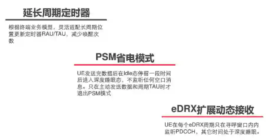 在低功耗上,NB-IoT和eMTC采用相同的技术,包括:PSM、eDRX和延长周期定时器。
