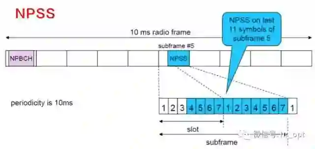 NPSS位于每10ms无线帧中5号子帧(#5),周期为10ms,使用每子帧中的最后11个OFDM符号(如下图)。