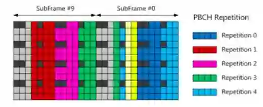 NPBCH信道与LTE的PBCH不同,广播周期640ms,重复8次发送,如下图所示,终端接收若干个子帧信号进行解调。
