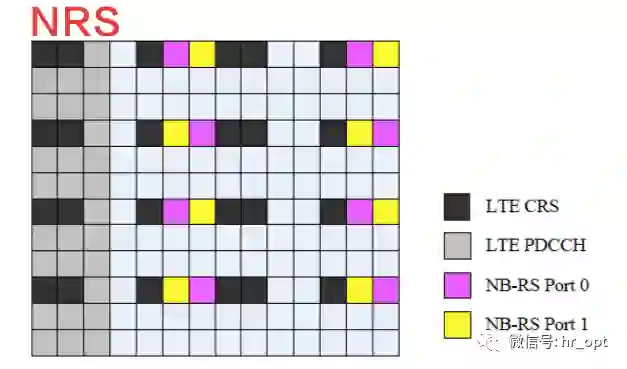 NRS与承载NPBCH、NPDCCH和NPDSCH的子帧中的信息承载符号时频复用,每天线端口每子帧使用8个RE。