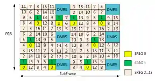 MPDCCH(MTC Physical Downlink Control Channel)用于发送调度信息,基于LTE R11的EPDCCH设计,终端基于DMRS来接收控制信息,支持控制信息预编码和波束赋形等 功能,一 个EPDCCH传输一个或多个ECCE(Enhanced Control Channel Element,增强控制信道资源),聚合等级为 {1,2,4,8,16,32},每个ECCE由多个EREG(Enhanced Resource Element Group)组成。