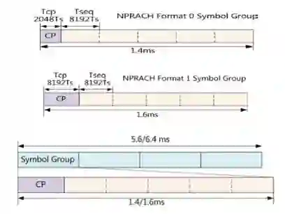 一次的Random Access Preamble传送包含四个Symbol Group,组成1个NPRACH信道,一个Symbol Group包括5个Symbol和1个CP(如下图)。