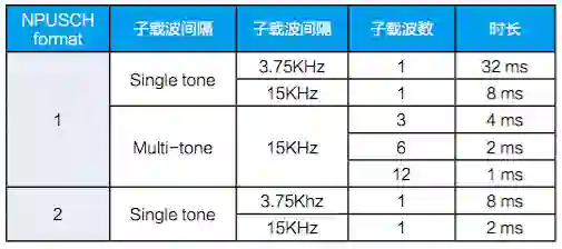 NPUSCH用来传送上行数据以及上行控制信息,上行子载波间隔有3.75KHz和15KHz两种,上行有两种传输方式:单载波传输 (Single tone)和多载波传输(Multi-tone),其中 Single tone的子载波带宽包括3.75KHz和 15KHz两种,Multi-tone子载波间隔15KHz,支持3、6、12个子载波的传输。