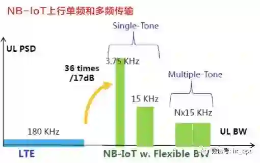 在上行方向,由于NB-IoT最小调度带宽为3.75K或15K,上行功率谱密度最大增强17dB,考虑GSM终端发射功率最大可以到33dBm,NB-IoT发射功率最大23dBm,所以实际NB-IoT终端比GSM终端功率谱密度最高可达7dB左右。