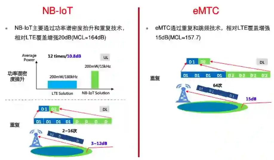 NB-IoT的覆盖目标是MCL 164dB,其覆盖增强主要通过提升上行功率谱密度和重复发送来实现。