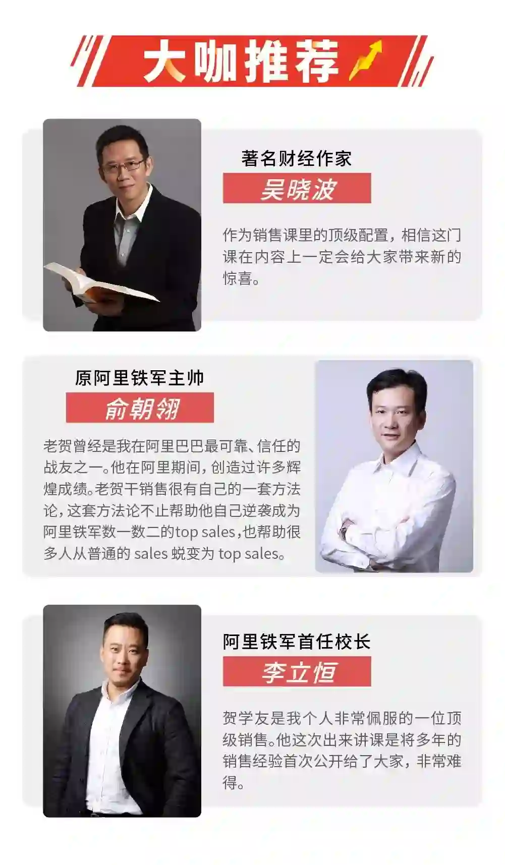 这一次的课程,贺学友向大众公开自己的销售方法。他花费一年时间,打造了《阿里全球销售冠军的——20堂进阶课》。