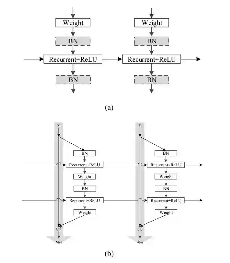图 1:( a ) 为 IndRNN 基本架构图解;( b ) 为残差 IndRNN 架构图解。