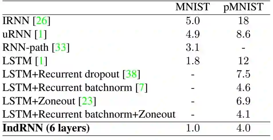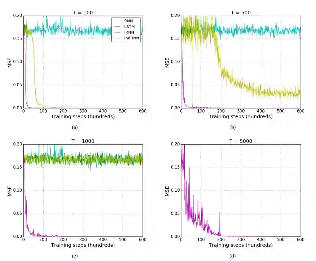 利用 IndRNN 可以保留长期记忆,处理长序列。实验表明,IndRNN 可以很好地处理 5000 步以上的序列,而 LSTM 能够处理的序列还不到 1000 步。