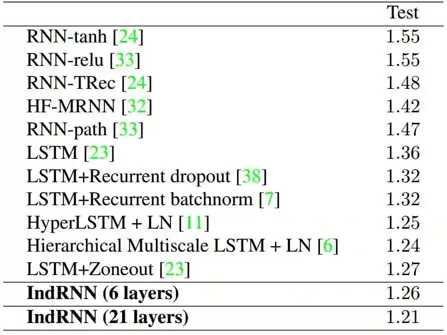 表 2:IndRNN 模型的 PTB-c 结果与文献记录结果的对比(基于 BPC)。