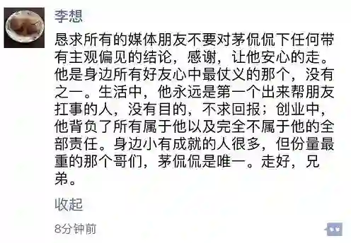 茅侃侃离开的消息传开之后,引发了一众好友的怀念,其中李想发出了充满真挚感情的一条朋友圈,在缅怀兄弟的同时,也暗暗地指出了部分原因:创业中背负了……完全不属于他的全部责任。