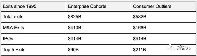 与 1995 年以来的消费者创业公司相比,2B 初创公司的资本总额回升了 40%。2B 和2C 创业公司产生了相当的 IPO 价值,但 2B 公司产生了 2.5 倍的并购价值。