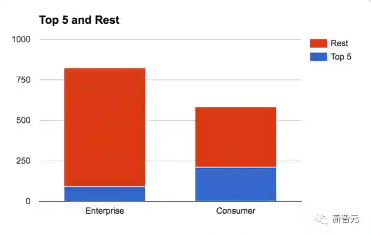 2. 更广泛的价值分布(distribution of value)意味着你有更大的可能创造一家独角兽企业。2B 企业的 Top 5 占据了总价值创造的 11%,而 2C 企业的 Top 5 的数据是那个的 3 倍多,达到了 36%。