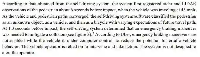 但是给AI泡沫最猛力一戳的是优步(Uber)自动驾驶汽车在亚利桑那州撞死行人的事故。从美国国家运输安全委员会(NTSB)的初步报告来看,我们可以看到一些令人震惊的声明: