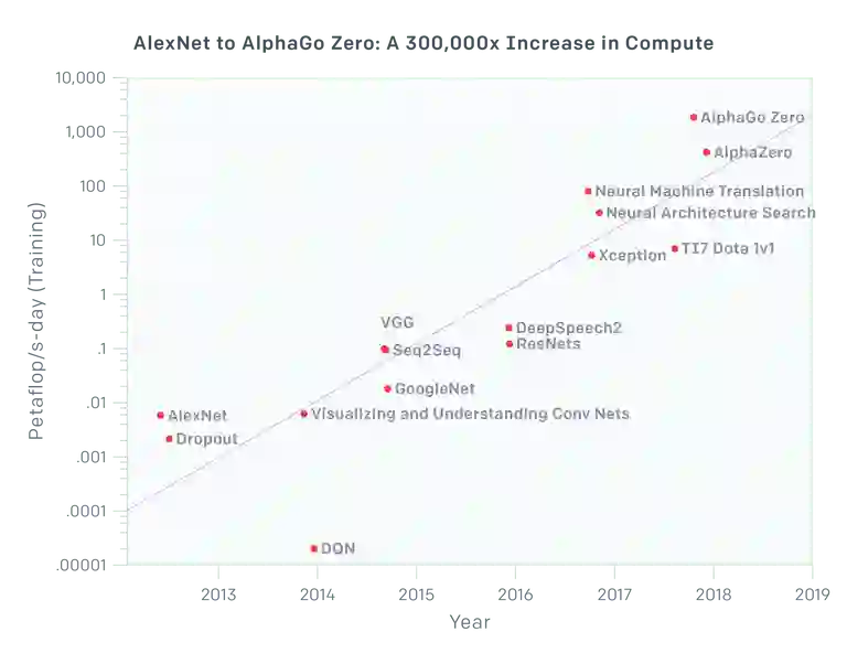 上面图中最近的三个点显示了与强化学习有关的项目,适用于Deepmind和OpenAI玩的游戏。尤其是Alpha Go Zero和更通用一点的Alpha Go获取的计算资源非常多,但它们并不适用于实际应用,原因是模拟和生成这些数据密集型模型所需的数据需要这些计算资源中的大部分。OK,现在我们可以在几分钟内、而不是几天内训练AlexNet,但是我们可以在几天内训练大1000倍的AlexNet,并获得性质上更好的结果吗?显然不能……。