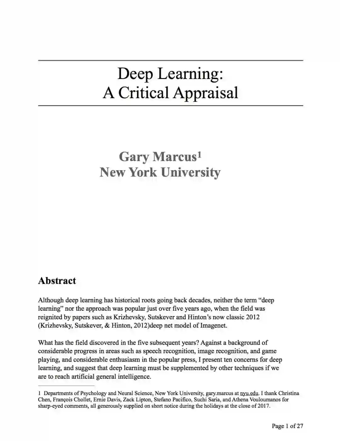 《深度学习:批判性评估》(https://arxiv.org/abs/1801.00631)