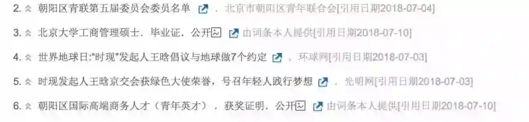 王晗个人的百度百科,同样标注了她是北京市青年联合会委员这一社会成就,以及获得了“青年英才”即2015年9月获得的朝阳区国际高端商务人才奖、2018年5月获得的国际绿色经济协会全球“时现”绿色行动大使称号。值得注意的是,从百度词条的引用来源看,“青年英才”,由王晗本人自我提供,且后者获得的这个所谓的全球“时现”绿色行动大使的称号,也非常巧合,彼时的王晗正是“时现”发起人,所以不用多说了吧。