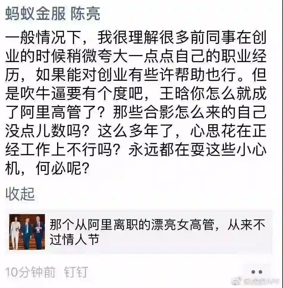 离现在最近的支付宝北京事务总经理上,已有前文所说的蚂蚁金服副总裁陈亮朋友圈表态,对王晗“阿里高管”的说法进行了打假,指她吹牛过度。