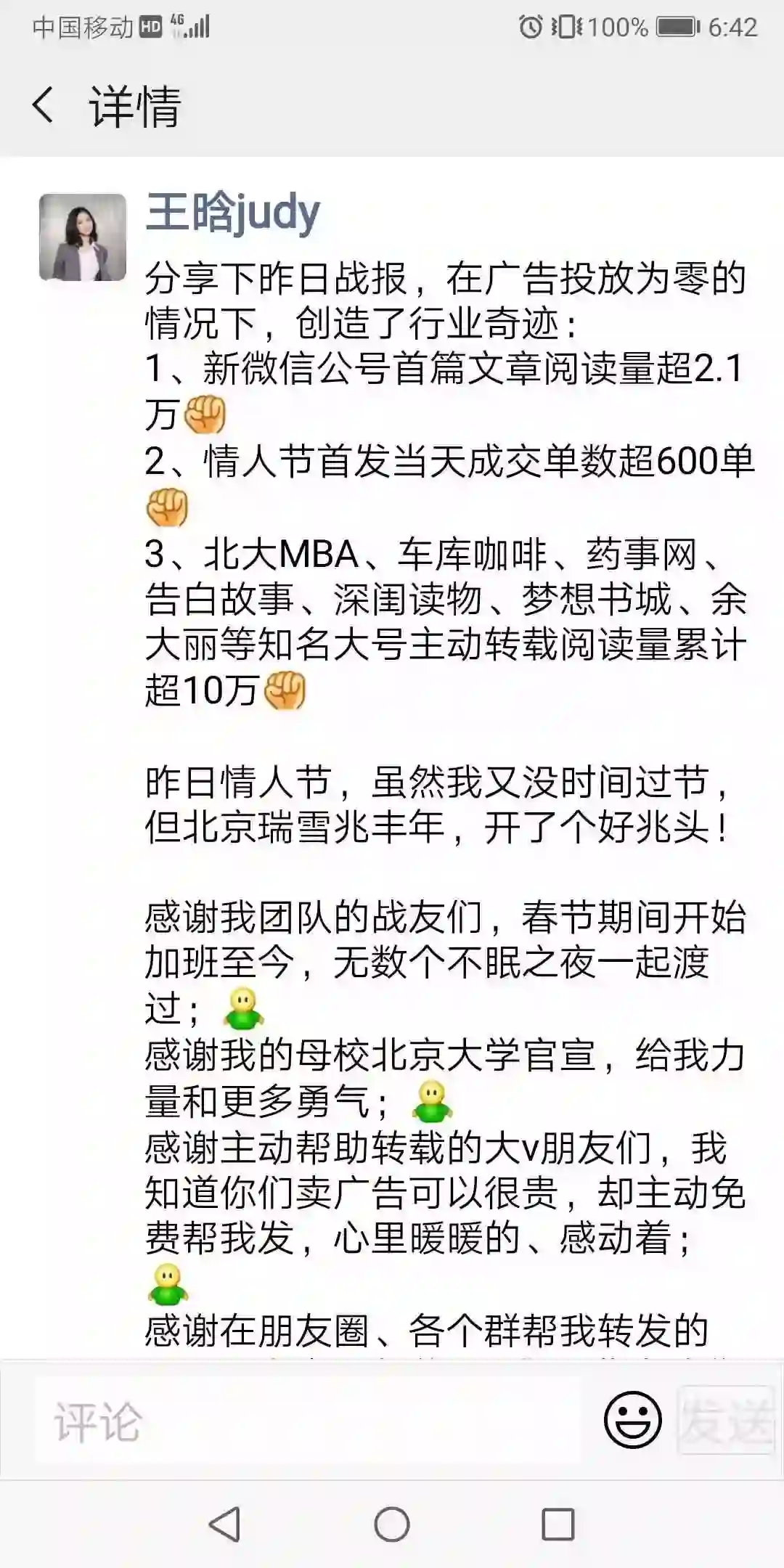 王晗本人也晒出了战绩:作为新微信公号文章首篇阅读便收到2万多阅读,此外不少大V都进行了转载,阅读总数已突破10万+。更关键的是,文章发出当天便实现了超600单的交易。