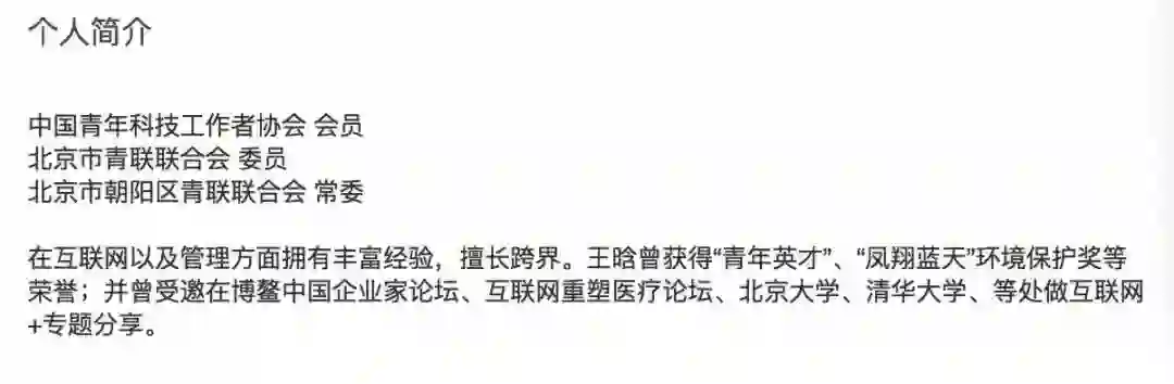 王晗领英上的个人简介中,她是中国青年科技工作者协会会员、北京市青联联合会委员、北京市朝阳区青联联合会常委。还曾获得“青年英才”、“凤翔蓝天”环境保护奖等荣誉;并曾受邀在博鳌中国企业家论坛、互联网重塑医疗论坛、北京大学、清华大学、等处做互联网+专题分享。