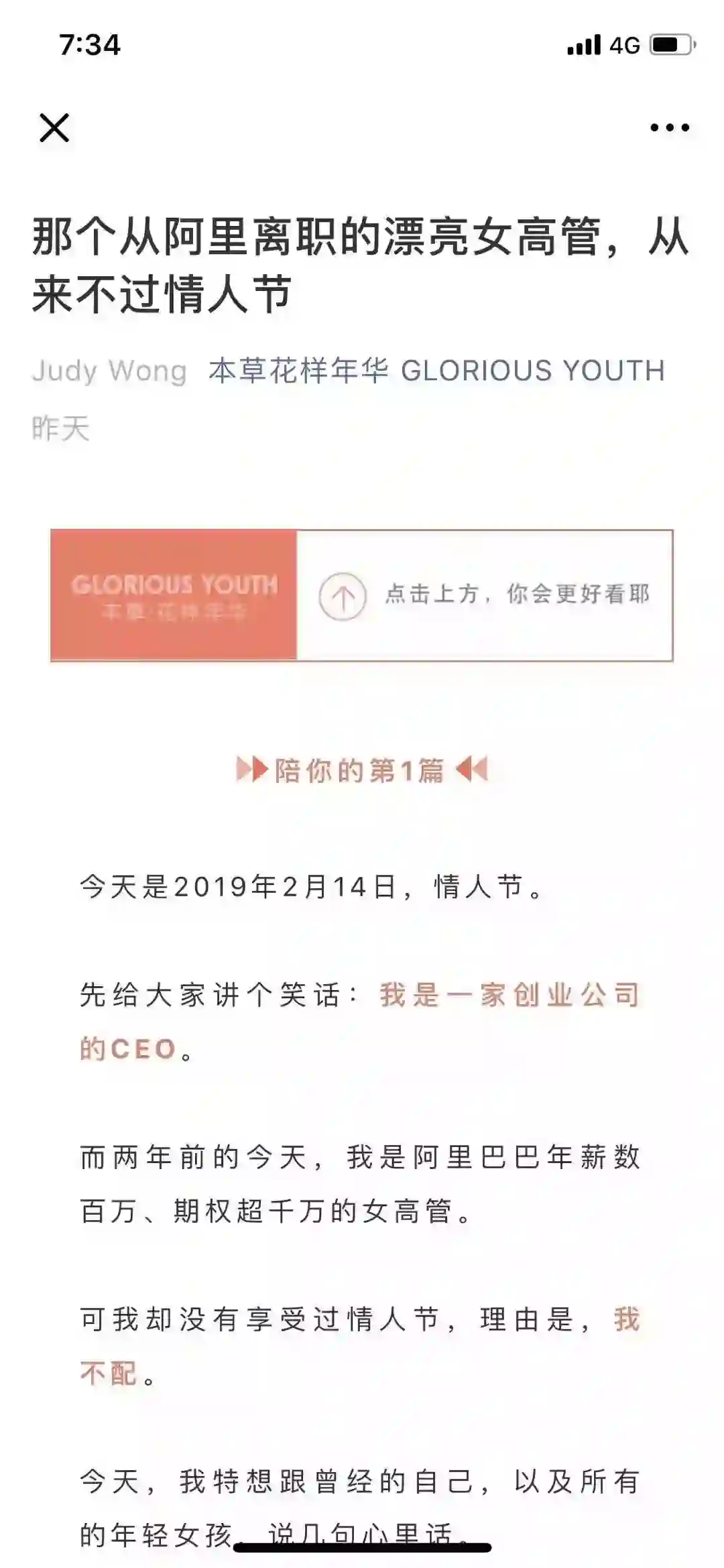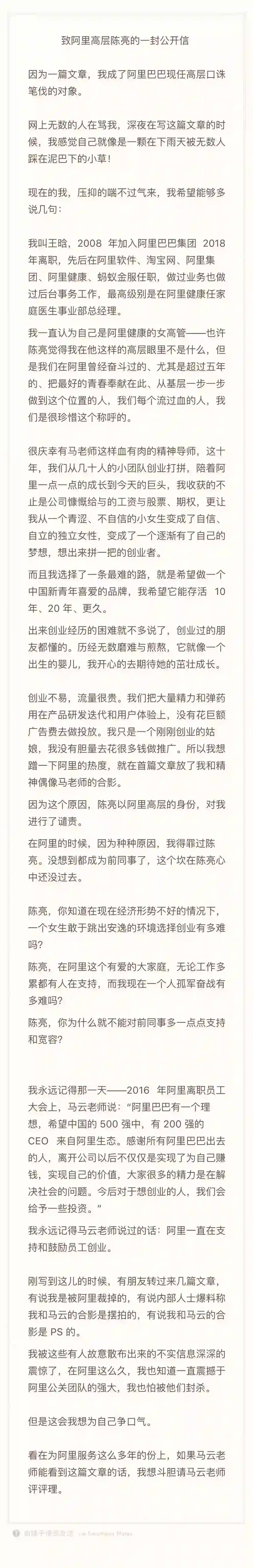 一个名为王晗的人,于2月14日当天在公众号上发表了一篇题为《那个从阿里离职的漂亮女高管,从来不过情人节》的文章。文章称,两年前的今天,她是阿里年薪数百万、期权超千万的女高管,自己之所以选择从阿里离职,则是为了创业,要打造一系列不输国际大牌、价格仅有它们十分之一的美妆产品。
