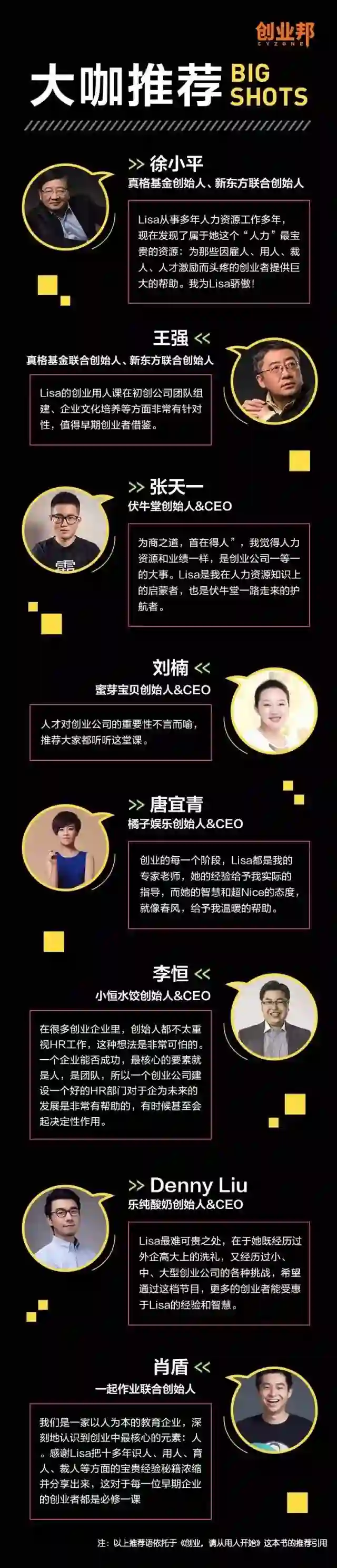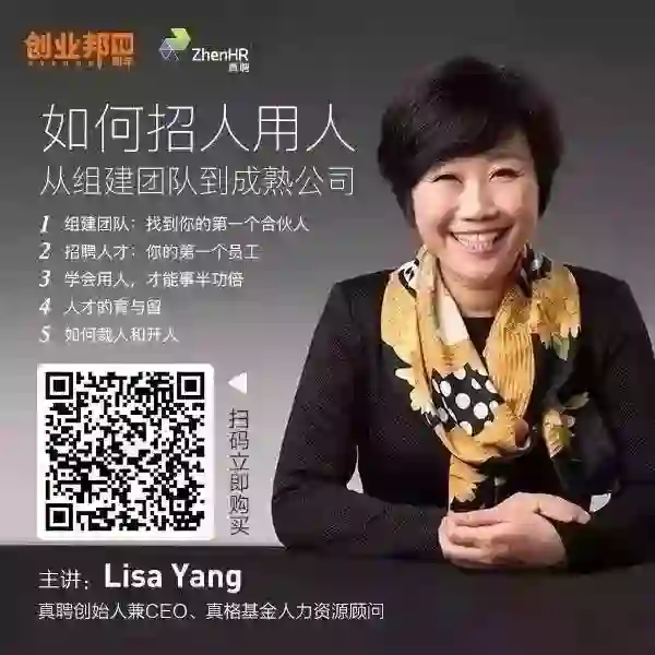 对人的选、用、育、留、裁,是每个创业者必须面临的问题,是创业者的一堂必修课,不管你是出于创业的哪个阶段,都离不开招人、用人和开人。因此,创业邦&真聘联合推出了一套人力资源系列课,从初期的组建团队到后期的开人留人,由Lisa老师为你全面讲解: