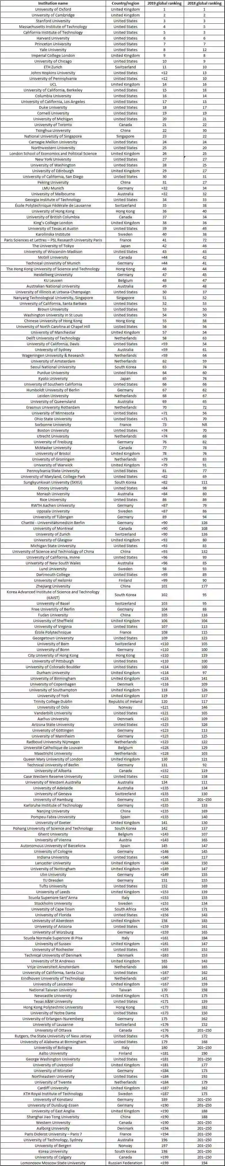 附泰晤士高等教育2019年世界大学排名TOP200: