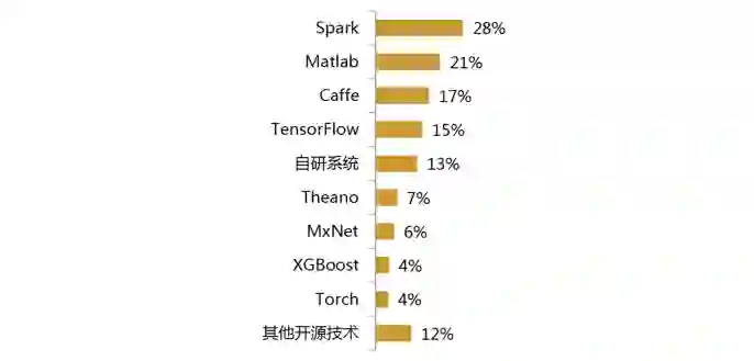 另一方面,分布式计算引擎Spark则是企业使用最多的机器学习框架。Spark专注于数据计算,具有内存计算速度快、运行时间短等特点,且生态系统丰富。随着Spark版本演进越来越成熟,它能更好地适用于数据挖掘与机器学习等需要迭代的算法中,由此吸引着越来越多的企业使用,占28%。而在深度学习框架使用方面中,Caffe、TensorFlow位居前列。