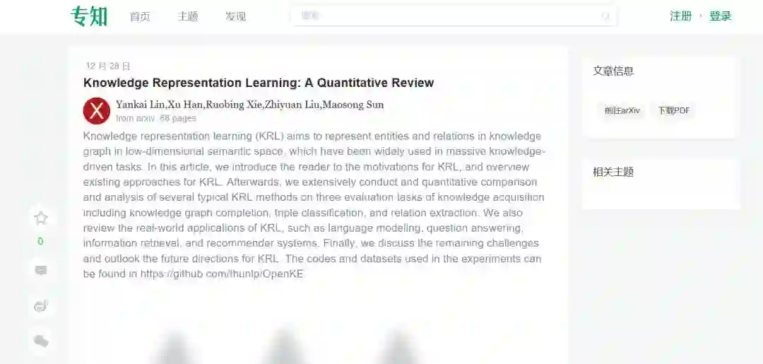 知识表示学习(KRL)是在低维语义空间中表示知识图中的实体和关系,在大规模的知识驱动任务中得到了广泛的应用。在本文中,我们将向读者介绍KRL的动机,并概述现有的KRL方法。然后,对知识获取的三种评价任务,包括知识图的完成、三重分类和关系提取,对几种典型的KRL方法进行了广泛的比较和定量分析。我们还回顾了KRL的实际应用,如语言建模、问答、信息检索和推荐系统。最后,我们讨论了KRL所面临的挑战,并展望了KRL未来的发展方向。