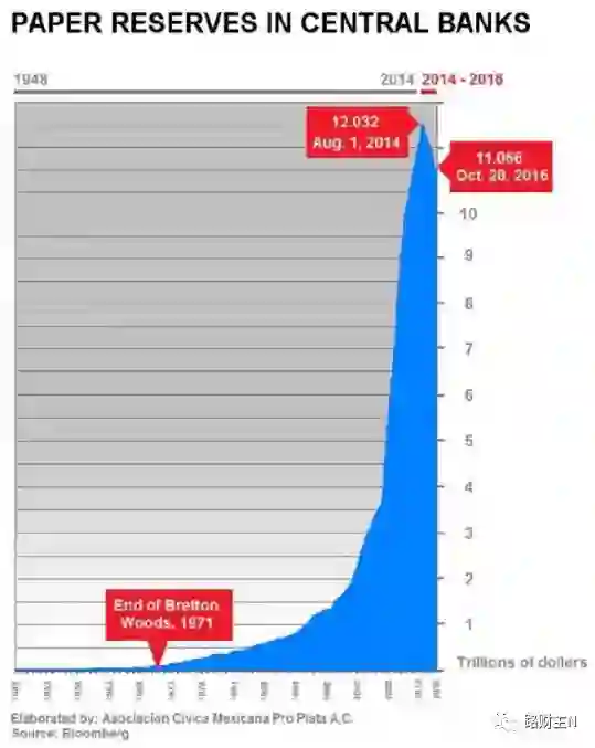 第三幅图,就是全球央妈从二战结束之后这70年来印钞的总体情况,从图中可以轻易看出,正是1971年布雷顿森林体系的崩溃带来了人类货币信贷的近乎无限扩张之路。