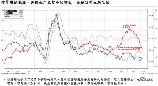 第一幅图,是过去10多年之间中国的信贷(Credit)增长率、广义货币供应量(M2)的增长率、采购经理人指数(PMI)和领先经济指标(LEI)的变动情况。